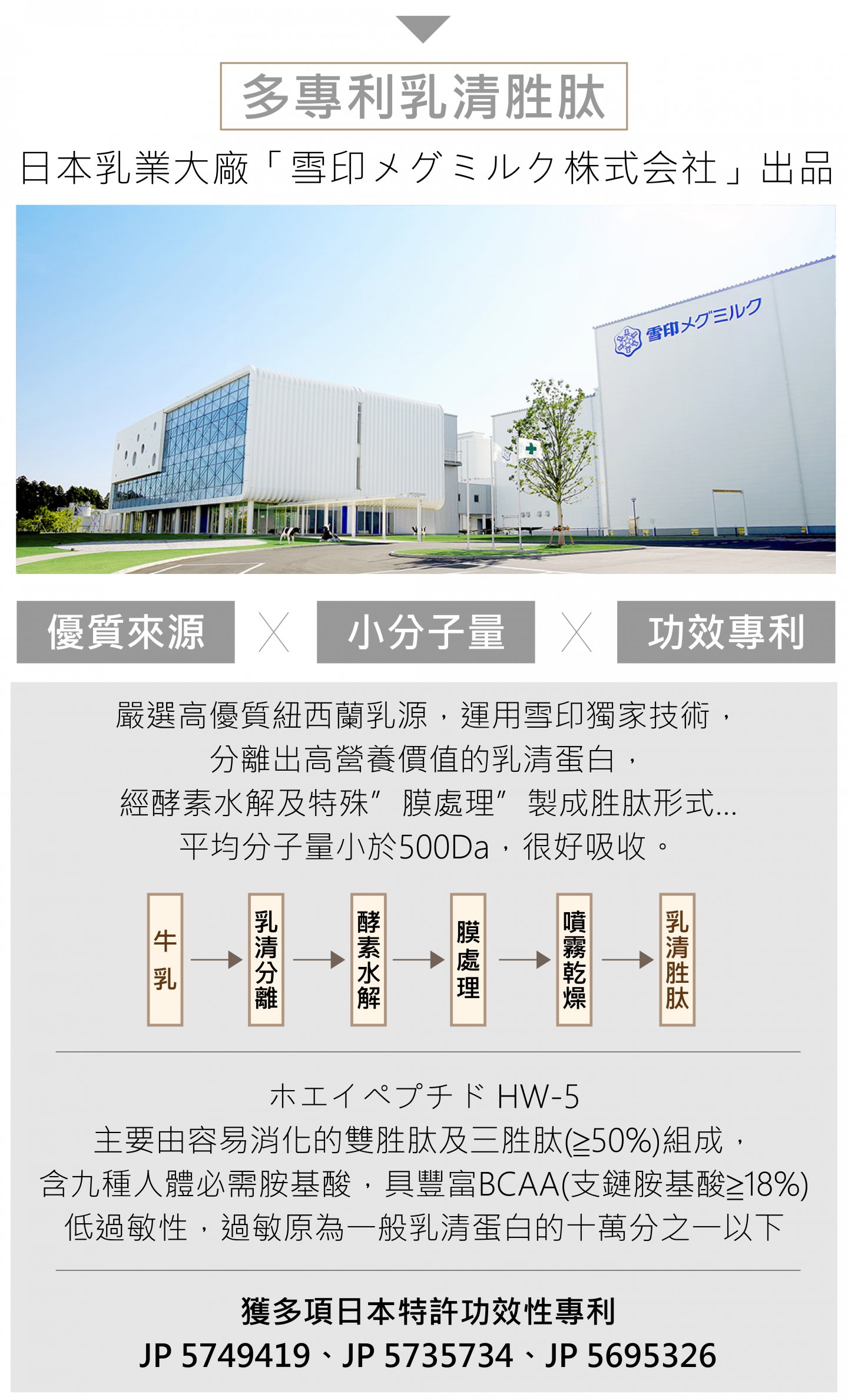 原料為日本乳業大廠「雪印メグミルク株式会社」榮譽出品;嚴選高優質紐西蘭乳源,運用雪印獨家酵素水解技術及特殊膜處理製成「胜肽」形式;平均分子量小於500Da、獲日本多項功效性專利( JP 5749419、JP 5735734、JP 5695326 )。